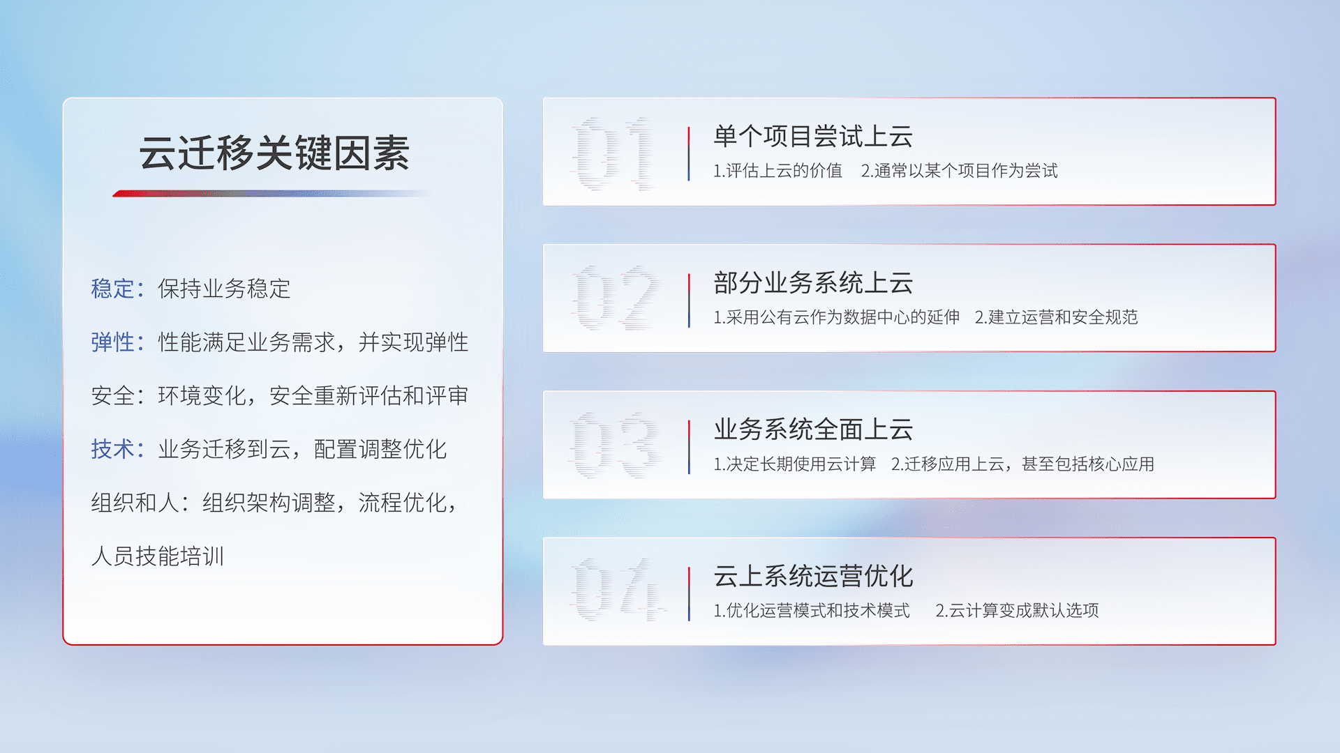 结合实际业务,,从规划设计、、云平台选型、、、、云原生改造、、、数据迁移、、集成交付,,迁移全过程为客户识别最佳上云路径,,做好风险识别管理,,,,设计网络架构、、、、身份权限、、安全审计合规、、、、操作审计、、、、日志审计、、、、监控告警策略、、、多站点容灾设计等,,,,对云上基础设施进行整体规划,,,,提升IT治理水平,,,,以满足弹性、、高可用、、高性能的需求。。。