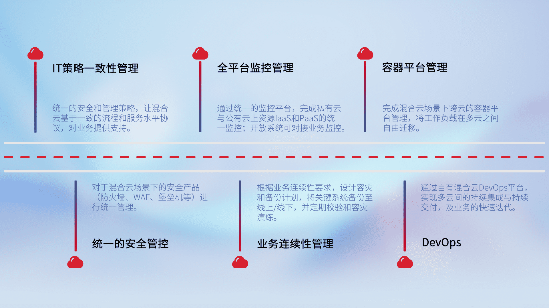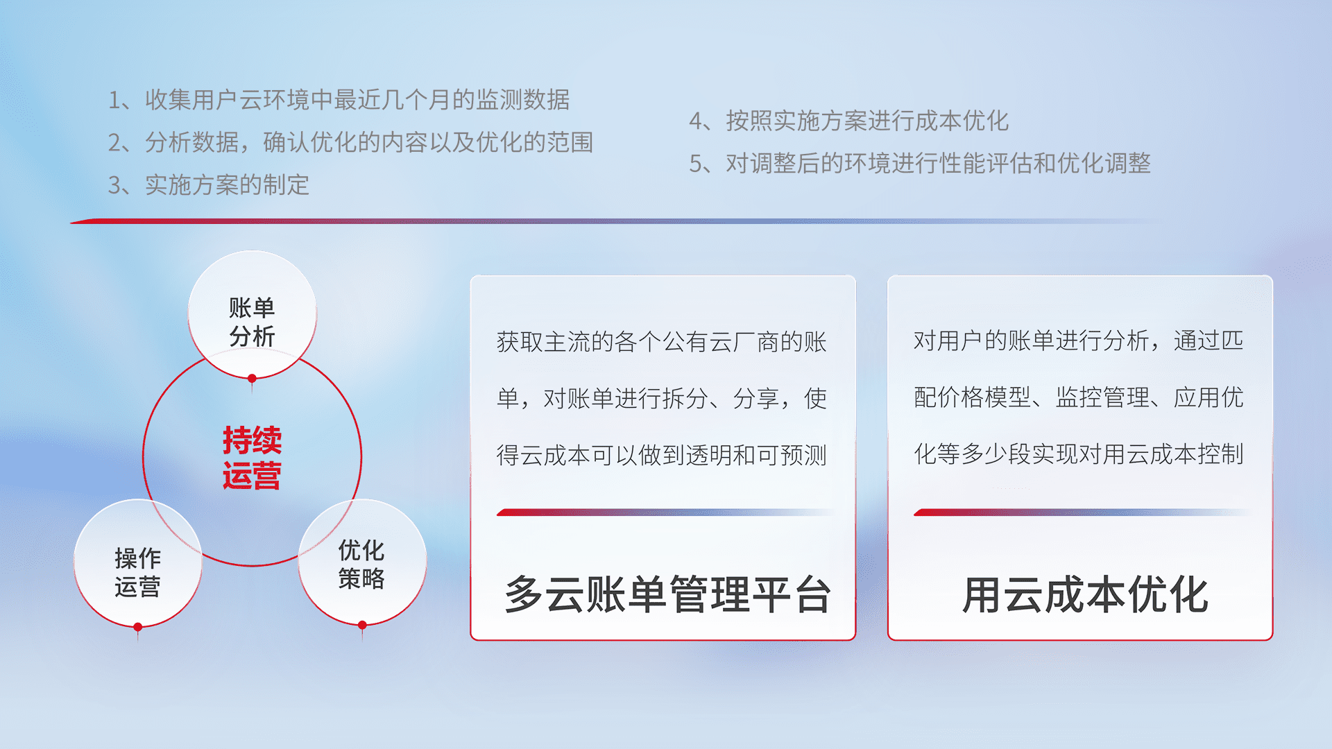 通过多云纳管,,,,以统一的资源数据模型把客户的云资源进行抽象和封装,,进而实现对多云资源的统一操作,,保障云资源管理的可靠性、、、稳定性与可用性。。。量身定制化运维内容,,配置、、、开发运维、、、、补丁管理、、、、备份、、、、监控、、、、认证和访问管理、、、审计和日常巡检等,,,,保障在用云过程中的可靠度,,稳定度以及高可用率。。。。