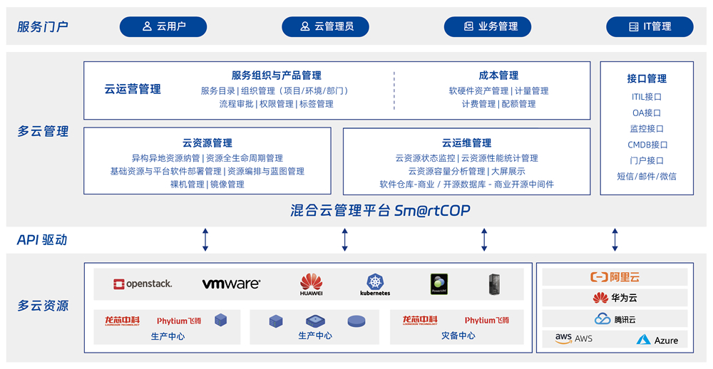 面向各行业用户多云资源管理、、运维及服务提供的综合挑战,,,提供异构异地异芯片多云资源的统一管理、、、统一运维、、、统一监控及统一运营服务,,简化多云管理复杂度,,提升用户用云满意度,,释放云平台业务价值。。。。