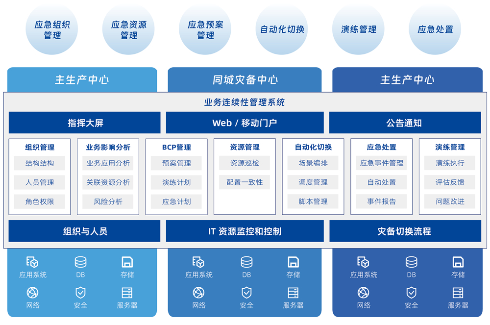 基于业务连续性全生命周期管理的设计理念,,,采用一体化的技术管理平台,,,,将风险分析、、、业务影响度分析、、预案开发和管理、、、应急演练、、、应急响应、、应急恢复等业务连续性相关工作全面覆盖,,,,帮助企业实现数字化的预案建模、、、、资源实例化、、、、预案演练、、、、预案自动化执行、、、、审计改进等各环节的闭环管理。。