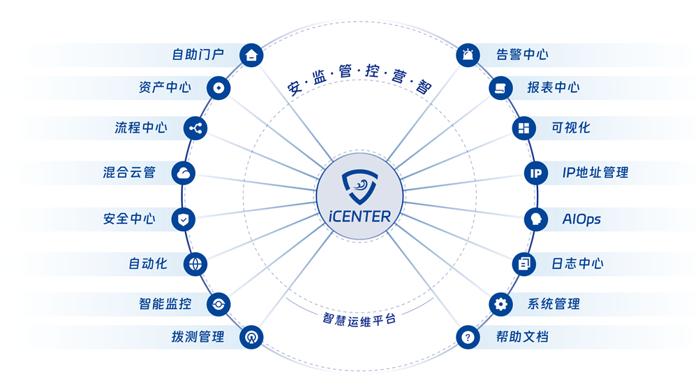 这是一款拥有自主知识产权及专利的产品。。。。创新地将安全服务与尊龙时凯传统核心运维服务有机的融合,,打造出集“安、、、、监、、、管、、、、控、、、、营、、智”为一体的智慧运维平台。。。。其中的安全中心模块已形成了以运维账号统一管理为基础,,,覆盖运维安全审计、、、、网络流量分析、、、云安全等众多运维场景的安全能力。。。