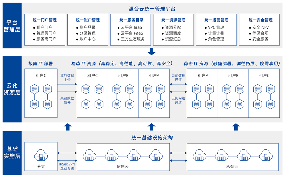 面向已部署多云、、、信创基础设施的行业用户,,提供自助化、、、自动化的云服务快速交付服务。。管理企业内部多个数据中心的物理、、、、虚拟资源,,以及容器、、、、私有云、、公有云资源,,,,并对以上资源进行混合编排,,,,提供基础软件和应用软件的自动化部署服务,,,以及云资源的全生命周期管理。。