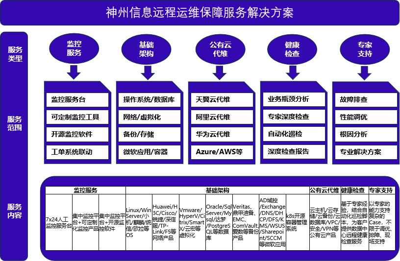 集中监控平台、、可定制化监控工具、、、、开源监控软件、、、安全堡垒机、、ITSM工单系统等,,,构成远程运维保障服务矩阵。。