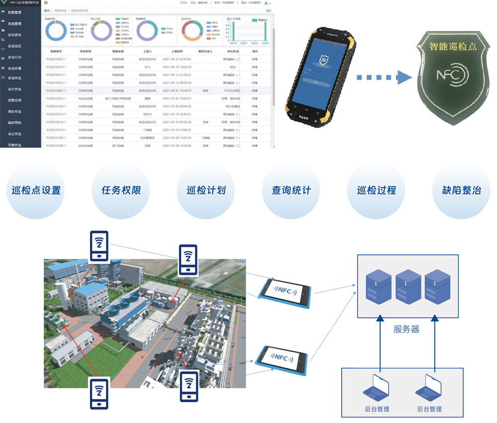 • 采用手机 NFC 的实现方式不但能够实时连接厂内网络,,,NFC 标签还避免了二维码容易损坏和可以复制的缺点。。